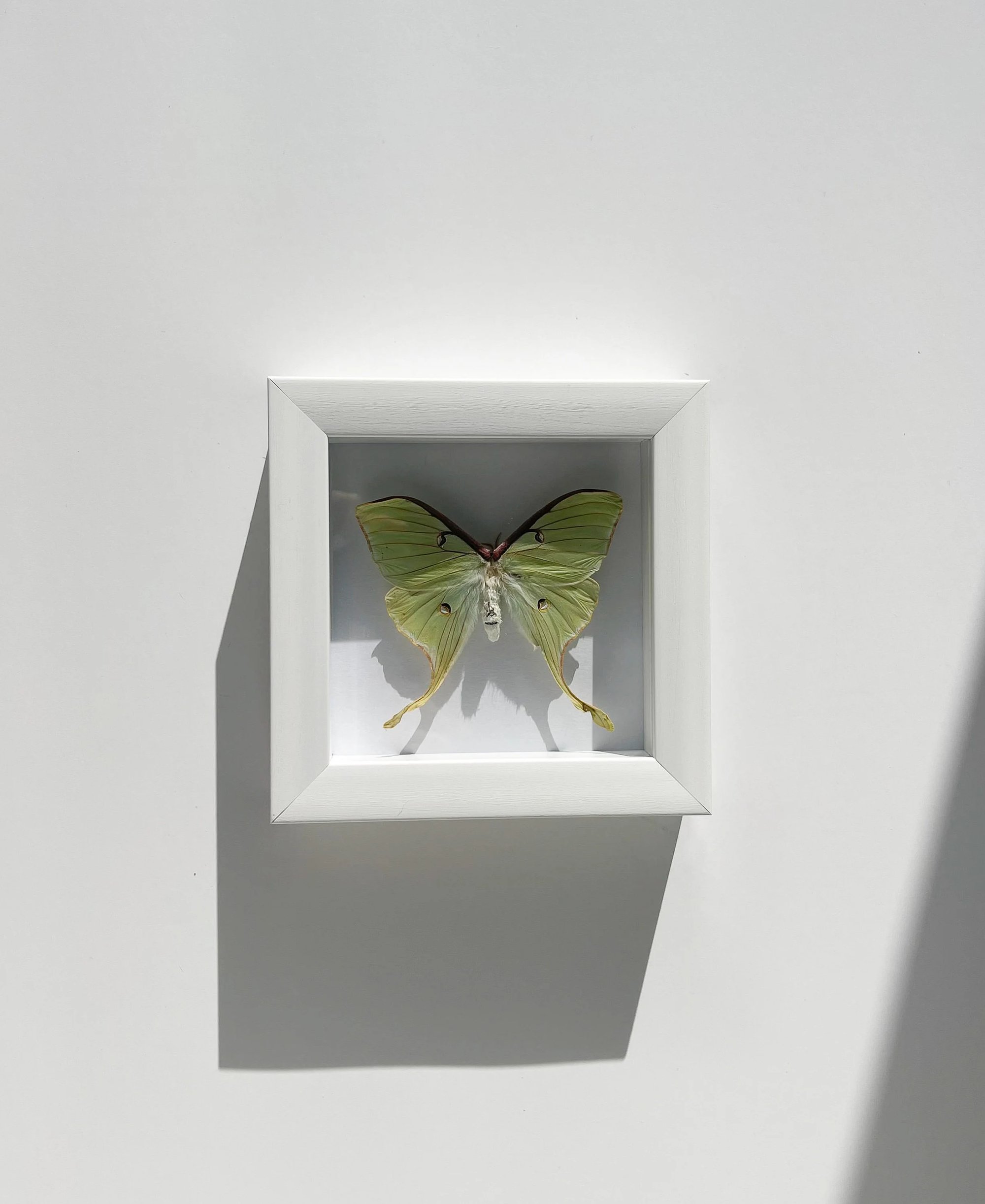 Real Actias luna (Luna moth) from the U.S., mounted on a white mat. Available as an 5x5 or 8x8 frame in black or white. Each moth will naturally vary in color and size.