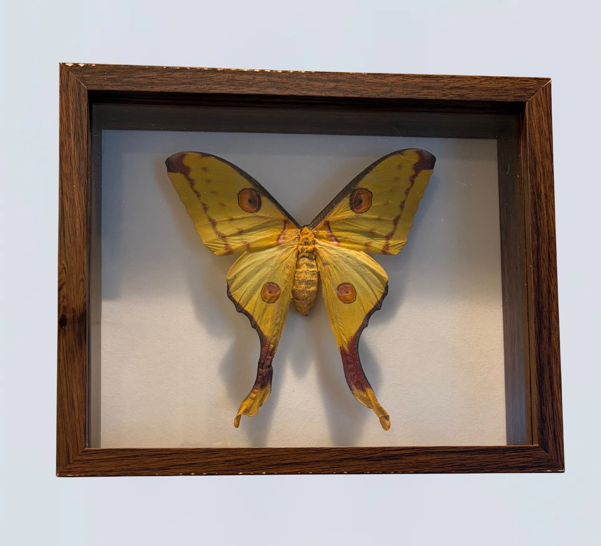 All specimens are ethically and sustainably sourced. Because these insects live their full natural lifespan, minor imperfections may be present (such as a missing antenna or a small wing tear). Each piece is prepared and framed with care, honoring the unique characteristics of the specimen.