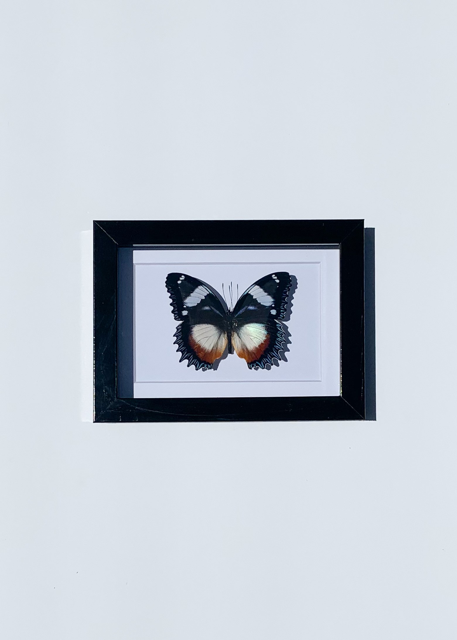 Real Hypolimnas dexithea from Madagascar, mounted on a white mat. Available as a 5x7 or 8x8 frame in black or white. Each butterfly will naturally vary in color and size.