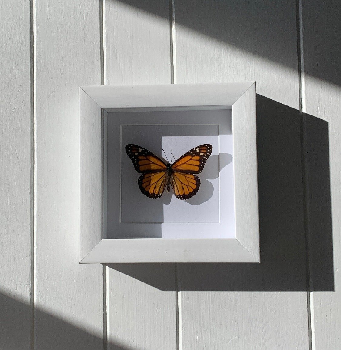 Real Danaus plexippus (Monarch butterfly) from the U.S., mounted on a white mat. Available as a 5x5 or 8x8 single frame, or as an 8x10 paired set. Each butterfly will naturally vary in color and size.