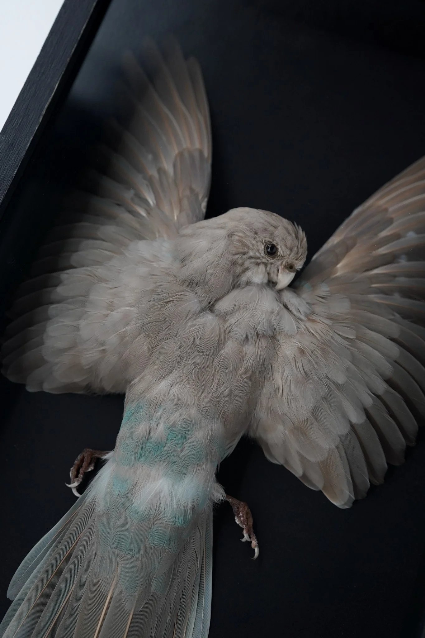 This shadow box highlights a blue/grey morph kākāriki (Cyanoramphus novaezelandiae), a rare aviary morph of a red-fronted parakeet. This scientific display presents a carefully preserved specimen mounted in a shallow shadow box designed for a wall display. Combining precise natural history preservation with avian artistry, this mount is perfect for collectors.